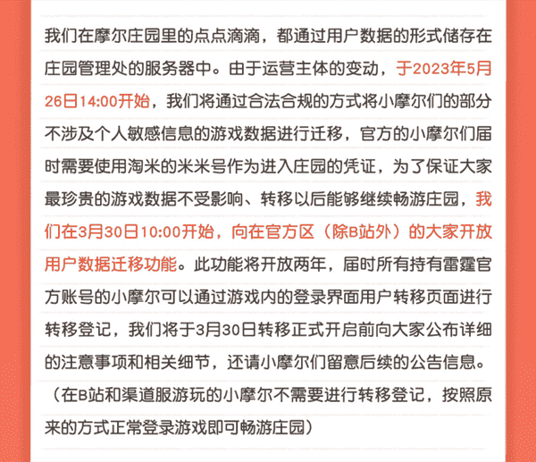 合作结束本就是开发方和代理方双方的事情,,降低这件事情对玩家的影响,,,才是对所有珍视这段童年的摩尔玩家最好的呵护。。。目前看来,,,用户完全不用担心后续因无法登录游戏而造成任何数据上的损失,,,只要及时进行账号转移,,,,就可以好好保留、、、、延续在庄园的痕迹和回忆,,继续在庄园里做快乐的红鼻子小鼹鼠。。