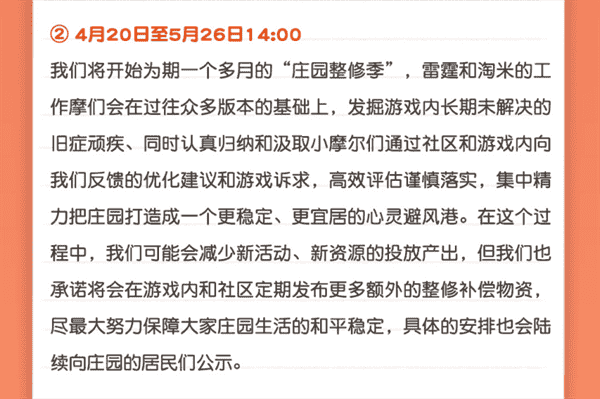 合作的结束并不意味着这个童年IP的结束,,,对于《摩尔庄园》手游而言,,,这是一个新阶段的开始。。。后续游戏内将开启庄园重构计划,,,会就以往遗留下来的BUG进行集中修复,,,并在游戏内和社区定期发布更多补偿物资。。。。
