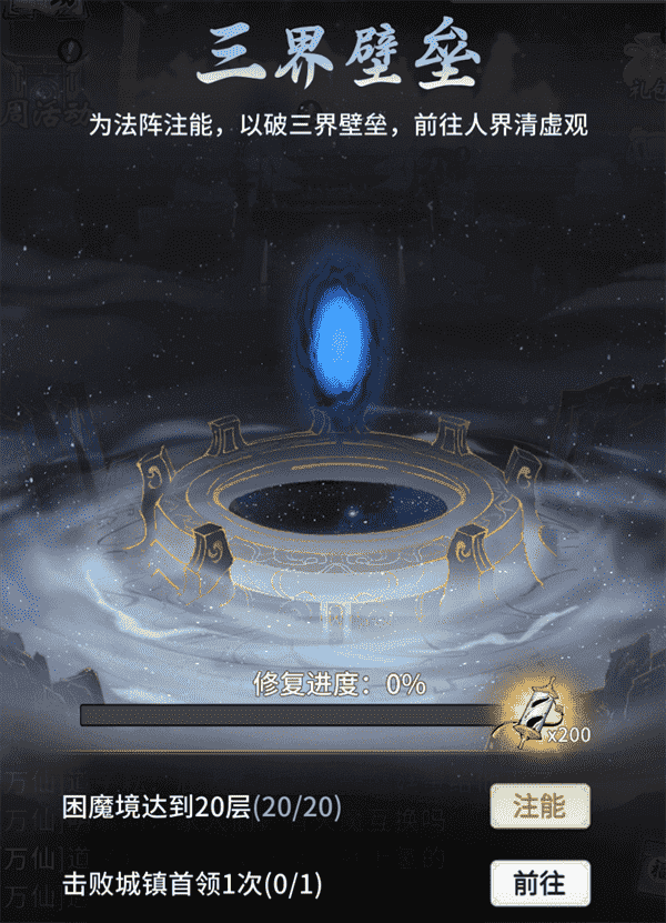 当你修为达到返虚/破虚中期后,,,,可在城镇寻得芸丫并激活神秘法阵,,,通过收集材料、、击败首领等方式为法阵注能,,,,借以打破三界壁垒,,开启支线剧情“清虚旧梦”